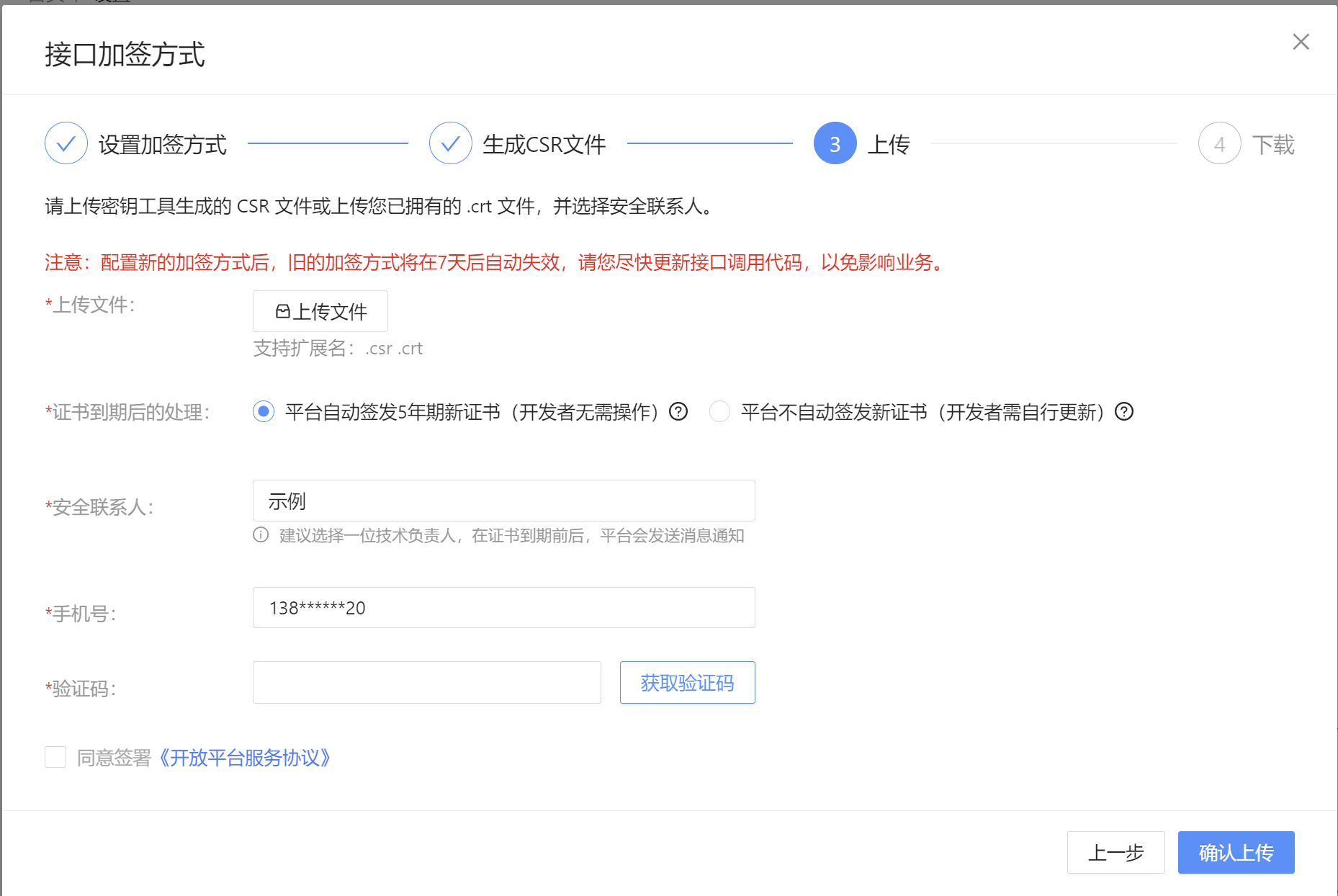 5、回到开放平台控制台,上传生成的 CSR 文件,设置安全联系人信息。点击 确认上传。